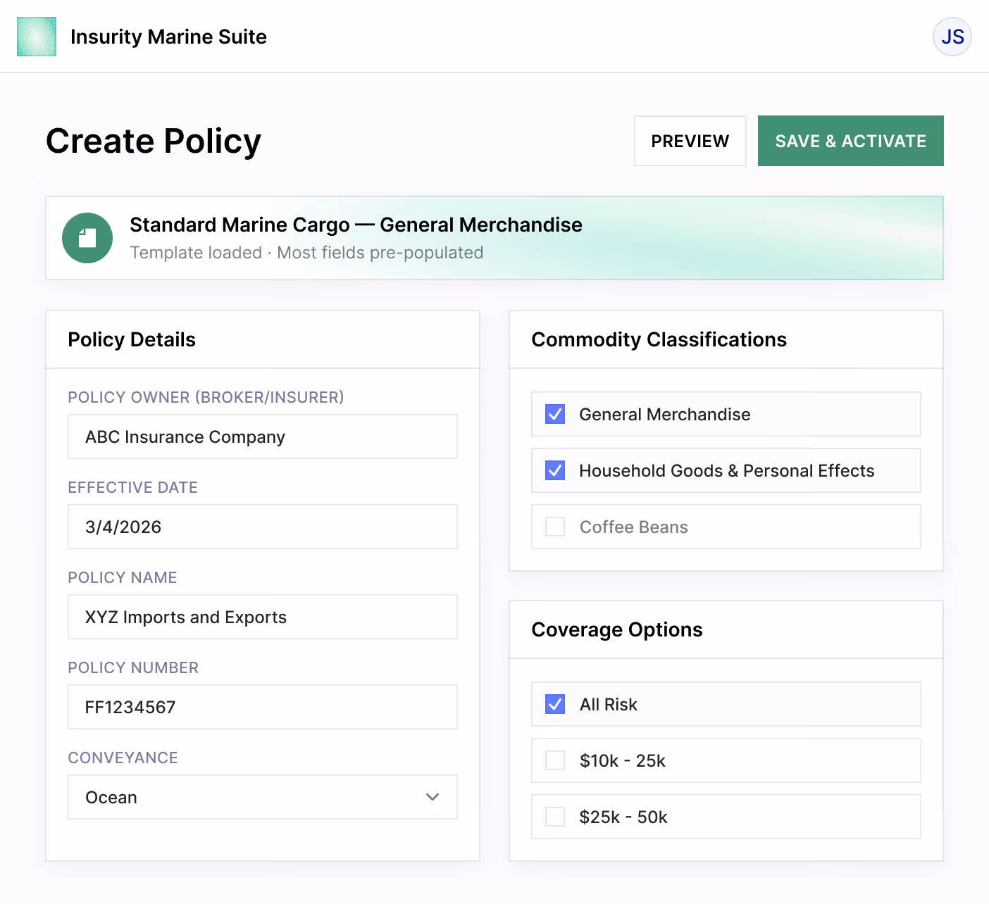 Issue certificates of insurance and manage marine cargo policies quickly with a configurable, modern, intuitive interface