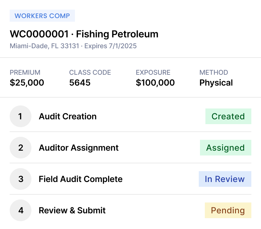 Mitigate the risk of premium fraud with automatic payroll validation that instantly pulls relevant audit data from 130+ payroll service providers. Easily catch fraudulent policies with payroll summaries that show names, duties, gross wages, overtime, and adjustment wages.