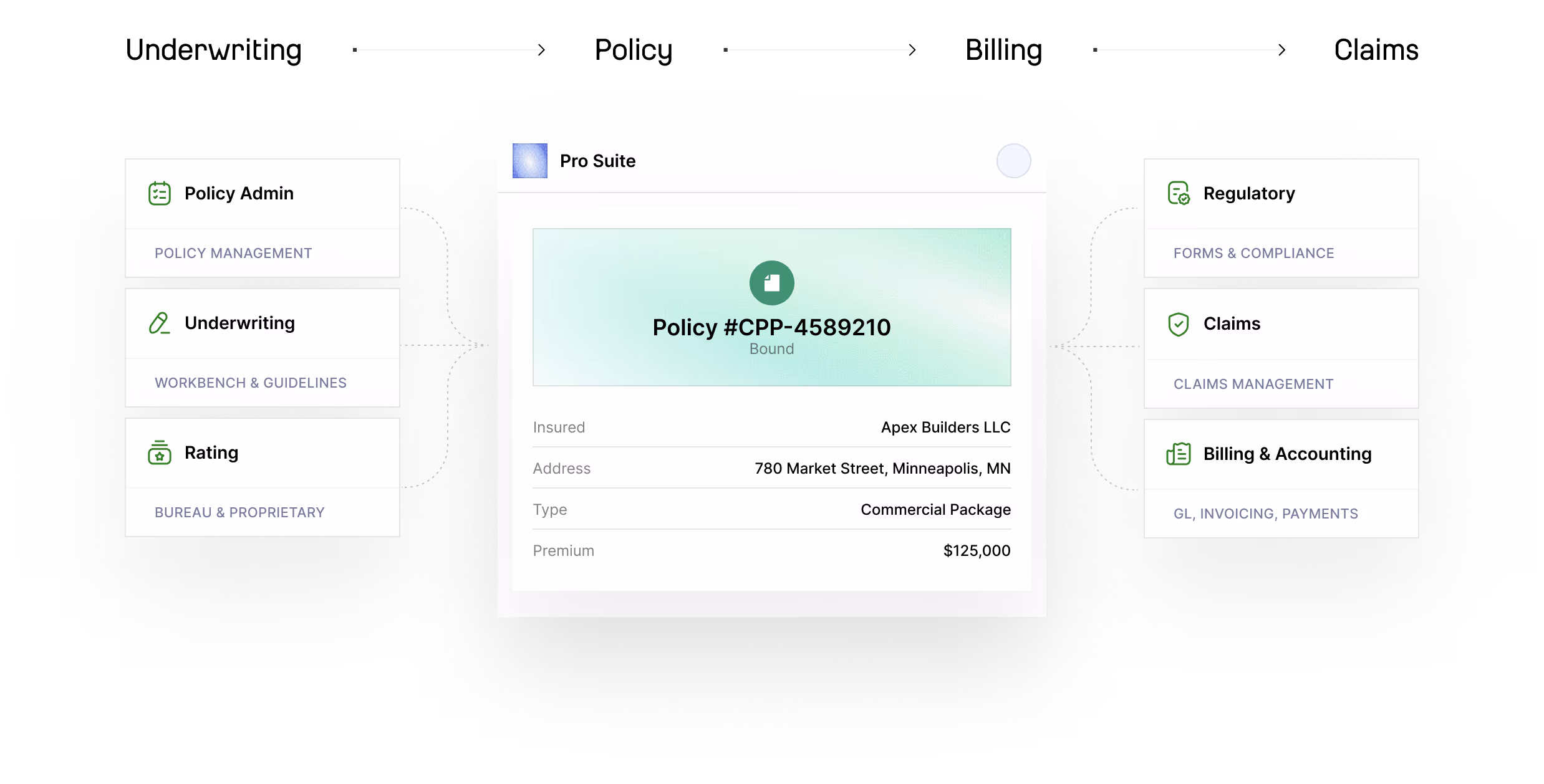- Eliminating re-keying and reconciliation through a native, shared system of record for policy, billing, and accounting